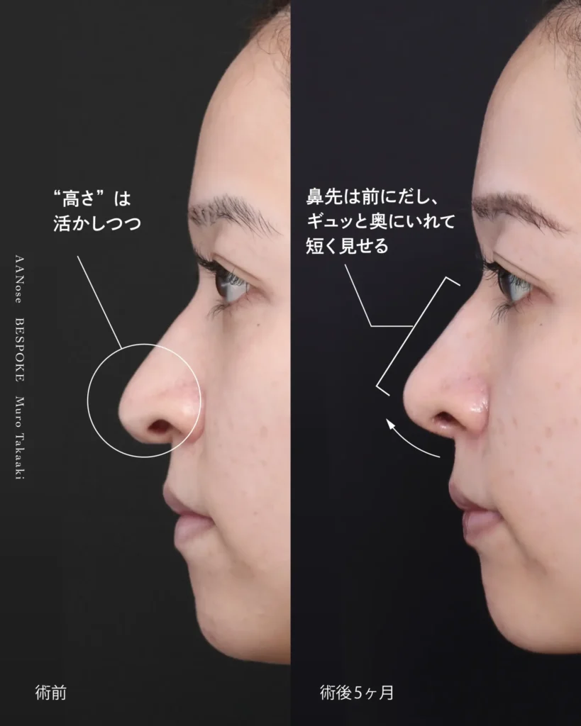 鼻単体の形を整えるのではなく、お顔全体の調和を重視し、10年後・20年後まで見据えた自然で洗練されたデザインを提案しています。