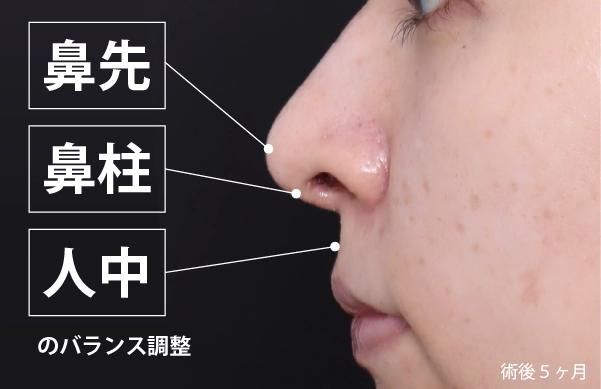 鼻先・鼻柱・人中のバランスは顔全体の印象を大きく左右するため、注意が必要です。鼻先の下がりが気になっている方でも、ただ鼻先だけを前に出した場合、正面から見た際に人中が長く見えて間延びした印象を与えてしまう恐れがあります。それを避けるために、鼻先は前方に出しつつ、鼻柱をわずかに下方向へ出すことで、 人中とのバランスを補正し、「大きく見えやすい鼻を自然に目立たなく」仕上げています。