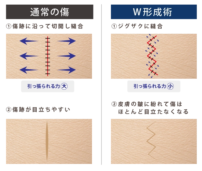 W形成術では、一直線の傷をあえてジグザグ(W字状)に切り直し、縫合します。