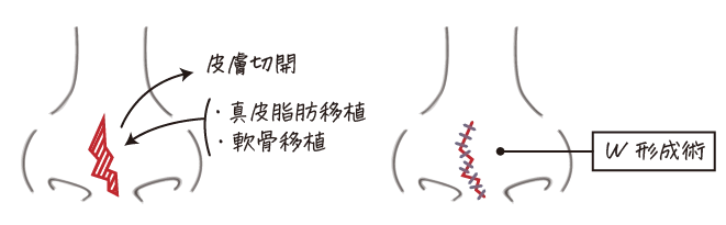 まずは半年間の待機期間を設け、炎症が完全に落ち着くのを待ちました。 手術では、硬くなった組織を丁寧にほぐした上で、凹んでしまった部分には「真皮脂肪移植」や「軟骨移植」を行い、欠損した組織を補填。 さらに、表面の傷跡はW形成術で目立たない形に再設計し、鼻の穴の形も「鼻孔縁挙上術」でバランスを整えました。 失われた組織を補い、形を作り直し、最後に傷跡を目立たなくする。 「修正」というよりは、鼻そのものを「再建(作り直す)」する覚悟で臨んだ症例です。