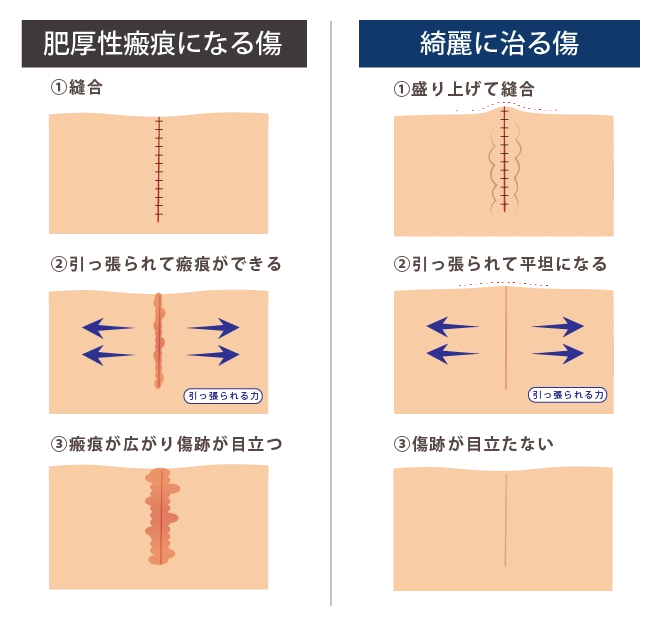 もう一つ、傷跡が目立つ原因に「肥厚性瘢痕(ひこうせいはんこん)」があります。傷が赤く盛り上がり、ミミズ腫れのような状態になることです。