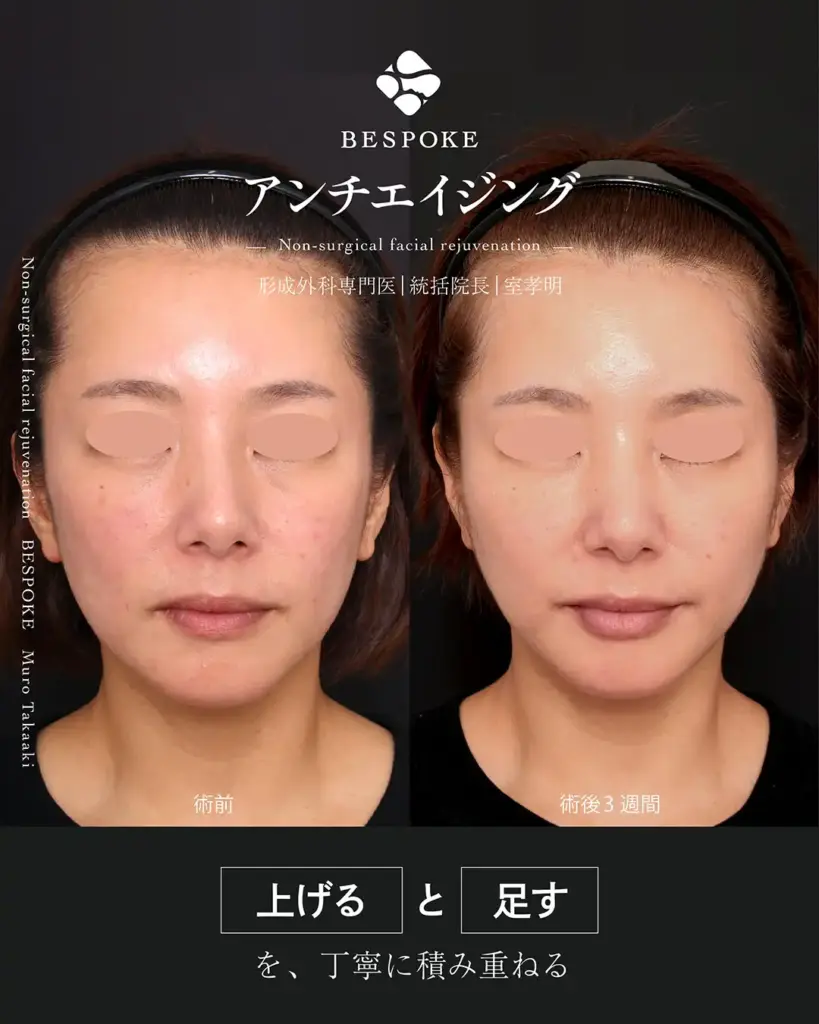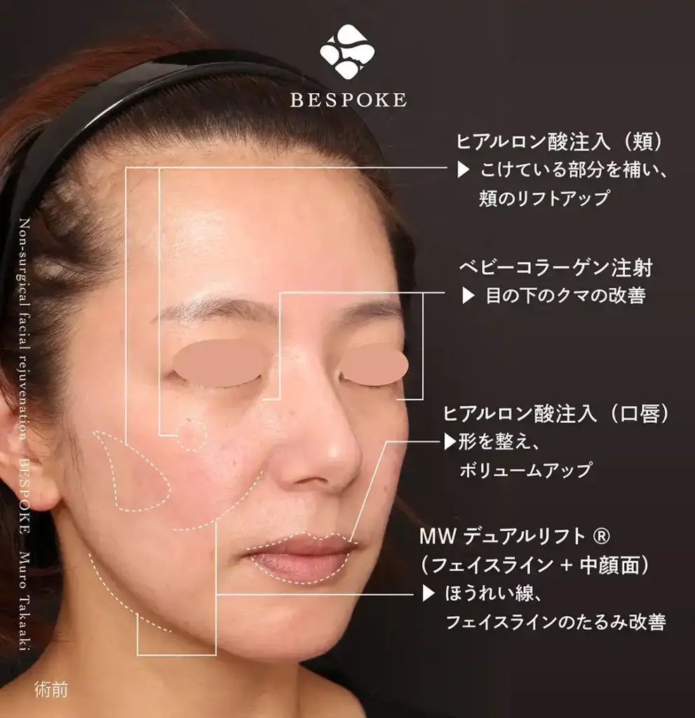 年齢とともに起こる変化は、たるみ・凹み・ボリュームロスなど、複数の要素が重なって現れます。私たちは特定のパーツだけを見るのではなく、お顔全体のバランスや動き、将来起こりうる変化まで考慮したうえで、その方にとって今、本当に必要な治療をご提案しています。 ビスポーククリニック統括院長の室医師は、加齢による顔貌変化を総合的に捉えた治療設計を重視し、外科的治療から注入治療まで幅広い選択肢を組み合わせながら、エイジングケアのご提案を行っています。