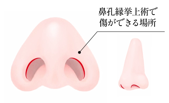 外側を切開する場合、小鼻は皮脂腺が多く、表情を作ったり呼吸をしたりする際によく動くため、傷に力が加わりやすいため、傷跡が目立ちやすいリスクがある部位と言えます。