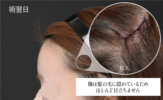 真皮脂肪より筋膜の方が強度が強いため、鼻筋に入れたプロテーゼの輪郭が浮き出てしまっているケース等、強度が欲しい場合は「側頭筋膜」を採取して移植します。 毛髪の中(髪の毛が生えている部分)を切開し、傷跡が目立ちにくい特殊な縫合方法(W形成術など)を行うため、傷は髪の毛で完全に隠れてしまいます。