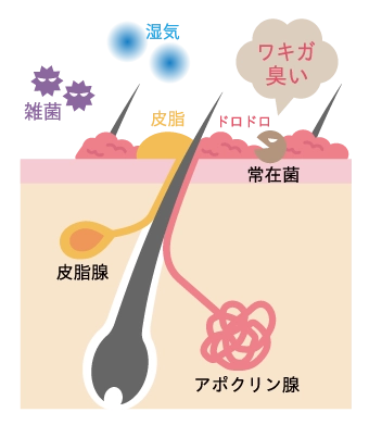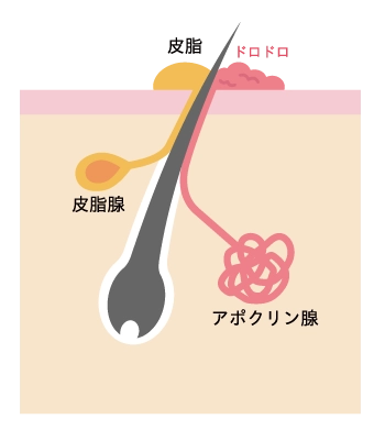 アポクリン汗腺から分泌された成分が、肌表面の細菌によって分解されることで、独特のニオイが生じます。