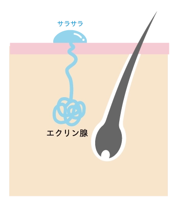 この体温調節を担っているのがエクリン汗腺です。エクリン汗腺は全身に分布し、サラサラとした汗を分泌します。汗そのものに強いニオイはほとんどありません。