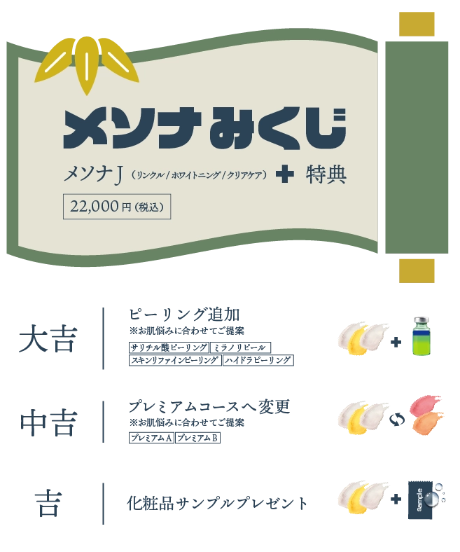 おみくじの結果次第で、ヒアルロン酸追加・ピーリング追加などの嬉しい特典がもらえます♪