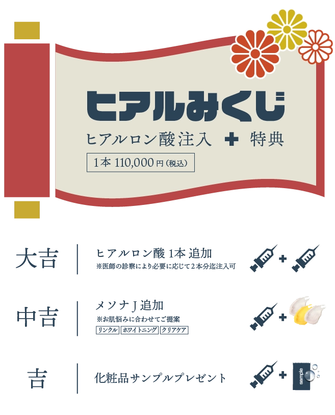 上記の期間に、美容おみくじ対象施術(ヒアルロン酸注入・メソナJ)をお受けいただけます。