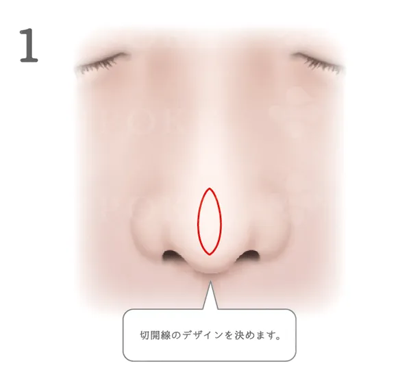 まず、団子鼻で皮膚が厚い場合、どの程度の皮膚を切除するかデザインを決定します。