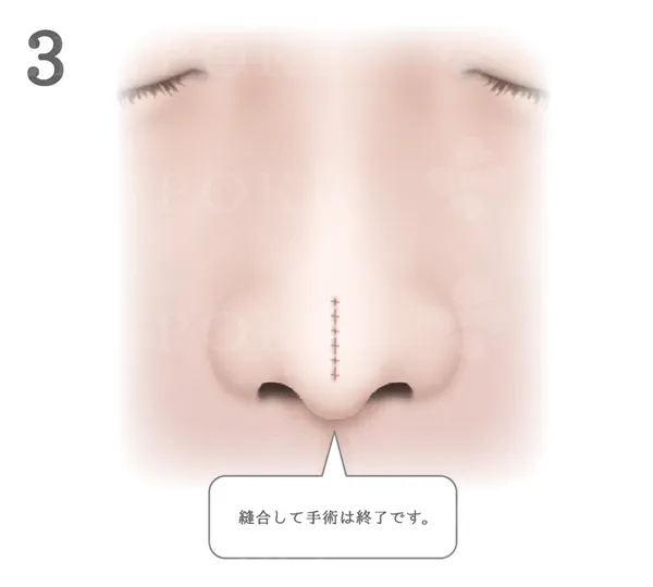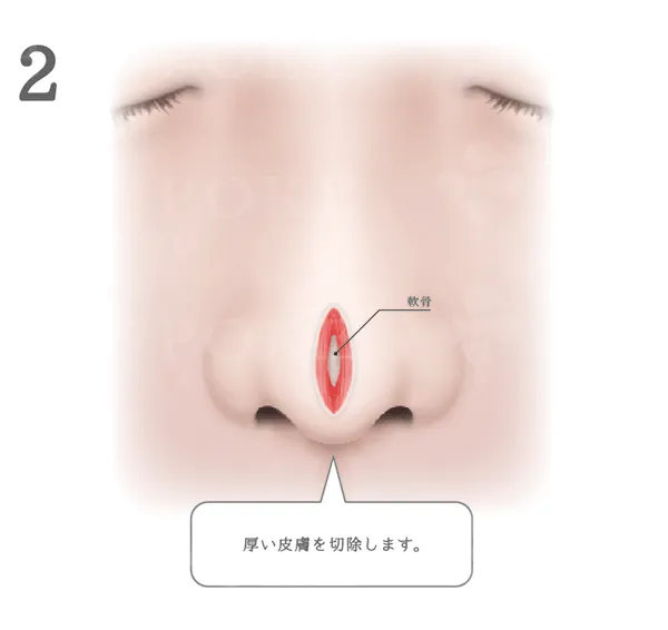 軟骨の縫合処理等は行わず、団子鼻の一番の原因である鼻先の厚い皮膚表面を縦に切開し、余分な皮膚と鼻の中の軟部組織のみを切除する手術です。