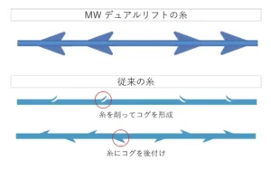 対してMWデュアルリフト®は、糸とコグ(突起)を一体成型する立体成型技術を採用。圧倒的な強度を誇り、たるんだ組織を強力に引き上げることが可能です。
